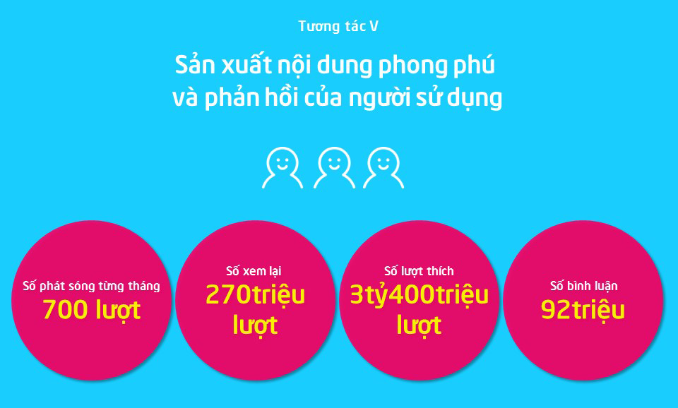 Nội dung có thể xem trên ứng dụng V bao gồm ba chương trình khác nhau: (1) các chương trình Trực tiếp đặc biệt (Special Live) với trọng tâm là các sự kiện quy mô lớn như buổi ra mắt album mới, buổi biểu diễn v.v…; (2) các nội dung Ứng dụng trực tiếp (App Live) do các ngôi sao trực tiếp sản xuất trong các lĩnh vực đa dạng khác nhau như nấu ăn, làm đẹp, giáo dục, tư vấn v.v… và (3) các chương trình Trực tiếp tại điểm nóng (Spot Live) là chương trình có thể gặp gỡ với các hình ảnh đời thường của các sao mà không báo trước v.v…Những người hâm mộ thay vì chỉ được nhìn thấy hình ảnh của các ngôi sao, còn có thể thể hiện tình cảm với ngôi sao bằng cách tham gia trò chuyện và gửi tim cho các ngôi sao. Các ngôi sao có thể truyền tải các câu chuyện khác nhau một cách đa dạng và sẽ nhận được các câu hỏi từ những người hâm mộ hoặc có thể biết được phản ứng của người hâm mộ theo thời gian thực. Chỉ sau 6 tháng kể từ khi ra mắt, ứng dụng V đã đạt tổng số lượt xem là 270 triệu lượt, số lượt thích (“bắn tim”) là 3,34 tỷ lượt và số người tham gia thời gian thực theo từng chương trình trực tiếp đang dao động trong con số hàng trăm nhìn đến hàng triệu lượt.