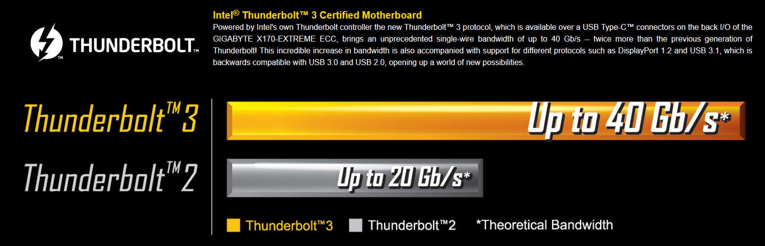 (STS:31.03.2016) Hãng Gigabyte ngày 28-3-2016 đã loan báo tại Taipei (Taiwan) việc họ tích hợp chuẩn kết nối Thunderbolt 3 của Intel lên bo mạch chủ GA-X170-EXTREME ECC.