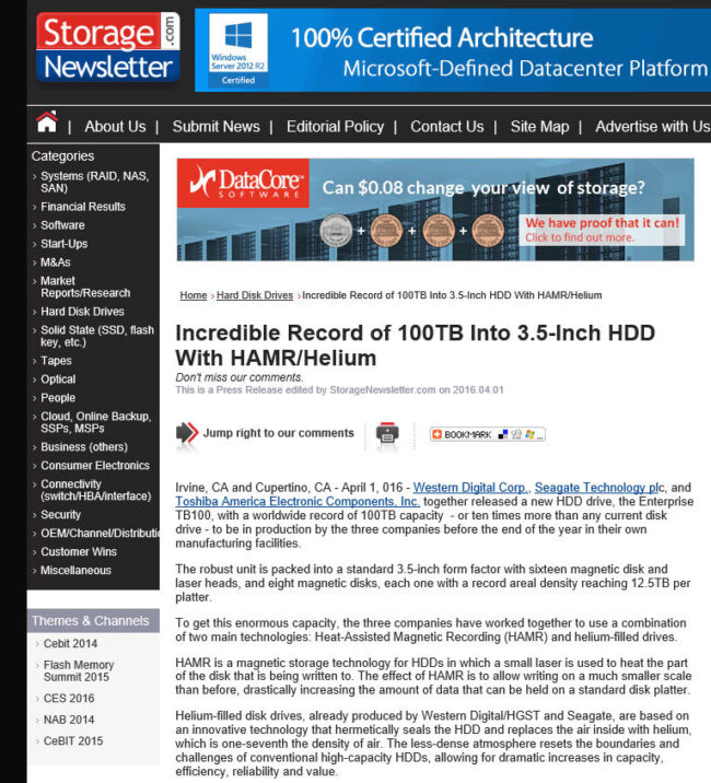 Dù đã đề cao tinh thần cảnh giác cao độ trong ngày Cá tháng Tư All Fools Day 1-4-2016, nhưng tôi cũng chỉ có thê giữ được mành lưới không bị thủng cho tới 8 giờ tối. Bởi khi mở hộp thư ra, tôi nhận được một e-mail của trang chuyên về thiết bị lưu trữ StorageNewsletter.com báo tin như vầy: “Incredible Record of 100TB Into 3.5-Inch HDD With HAMR/Helium” (Kỷ lục không thể tin được là nhét 100TB vào trong ổ HDD 3.5 inch với công nghệ HAMR/Helium).