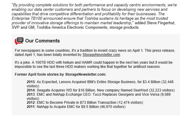 Cuối cùng, ở phần COMMENT, trang StorageNewsletter.com lật bài ngửa: Đây chỉ là một chuyện đùa trong Ngày Cá tháng Tư. Các chi tiết về các công nghệ là chính xác, nhưng để có được 1 ổ HDD với công nghệ HAMR và helium, người ta cần phải mất khoảng 10 năm nữa. Nhưng điều quan trọng là sự hợp tác giữa 3 hãng chuyên sản xuất thiết bị lưu trữ này sẽ không thể xảy ra vì vi phạm luật chống độc quyền của Mỹ.