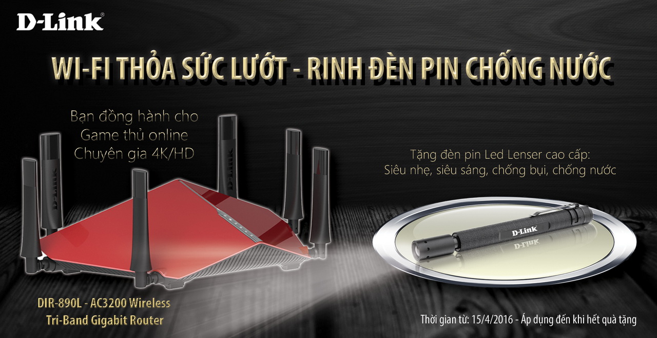 – Thể lệ tham gia: khi mua model DIR-890L (AC3200 Wireless Tri-Band Gigabit Cloud Router), khách hàng sẽ nhận ngay 1 bộ đèn pin hiệu Led Lenser cao cấp siêu nhẹ, siêu sáng, chống bụi, chống nước