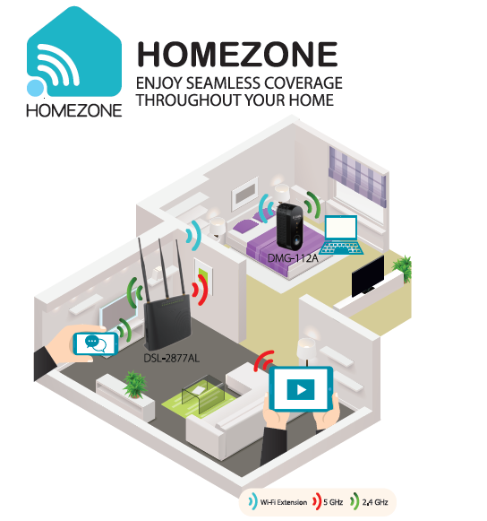 Để khách hàng không phải mất thời gian đăng nhập lại vào hệ thống mạng, D-Link đã tạo ra giải pháp Autozoning (Homezone) – với tính năng cho phép tự động chuyển đổi qua lại giữa 2 mạng Wi-Fi khác nhau. Công nghệ này được tích hợp đặc biệt trong 2 thiết bị DSL-2877AL (Dual Band Wireless AC750 Router/ADSL 2+ Modem Router) và DMG-112A (Wi-Fi Range Extender), giúp bạn di chuyển thoải mái khắp nơi trong nhà và qua lại giữa hai khu vực phủ sóng Wi-Fi.