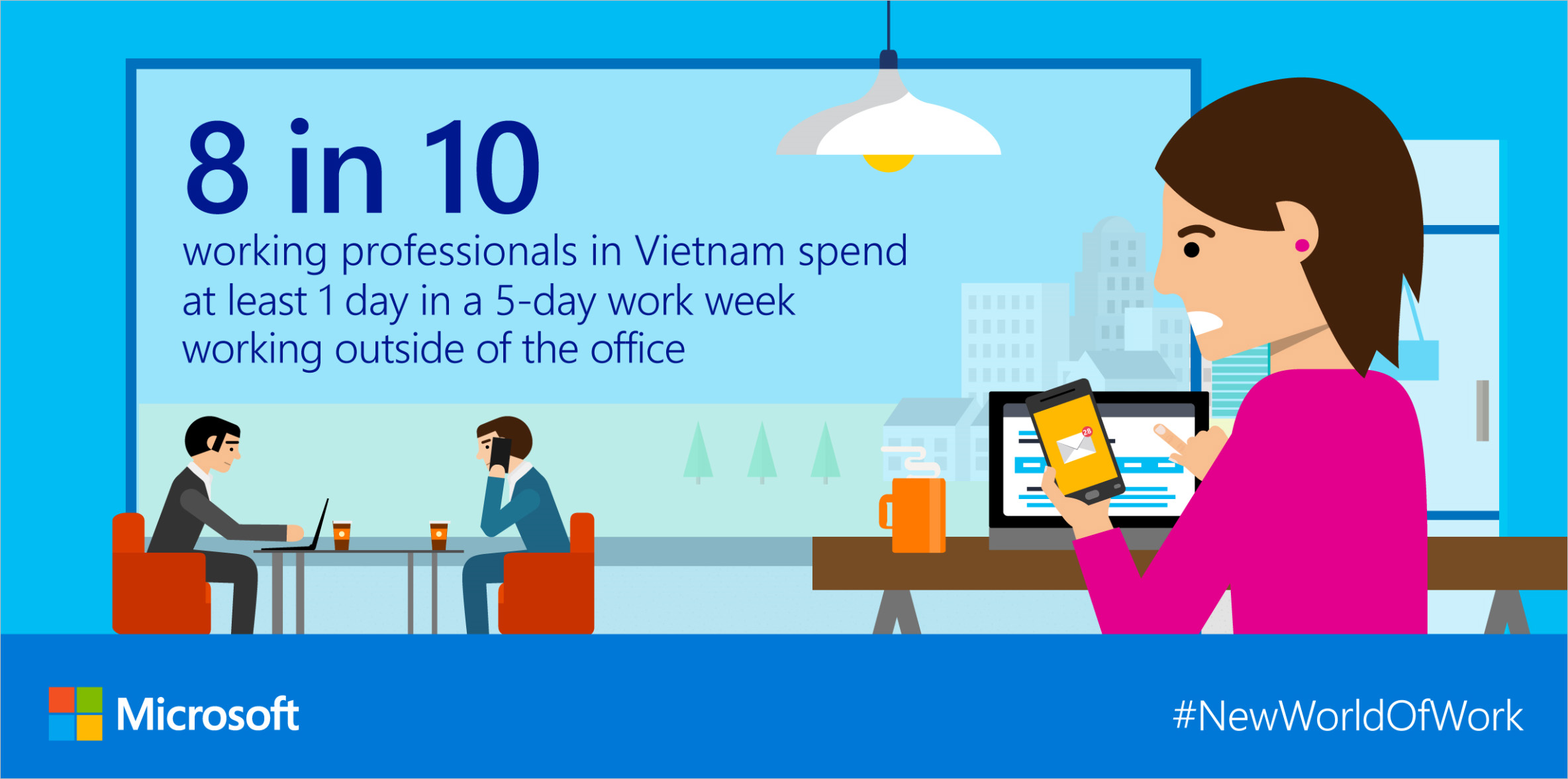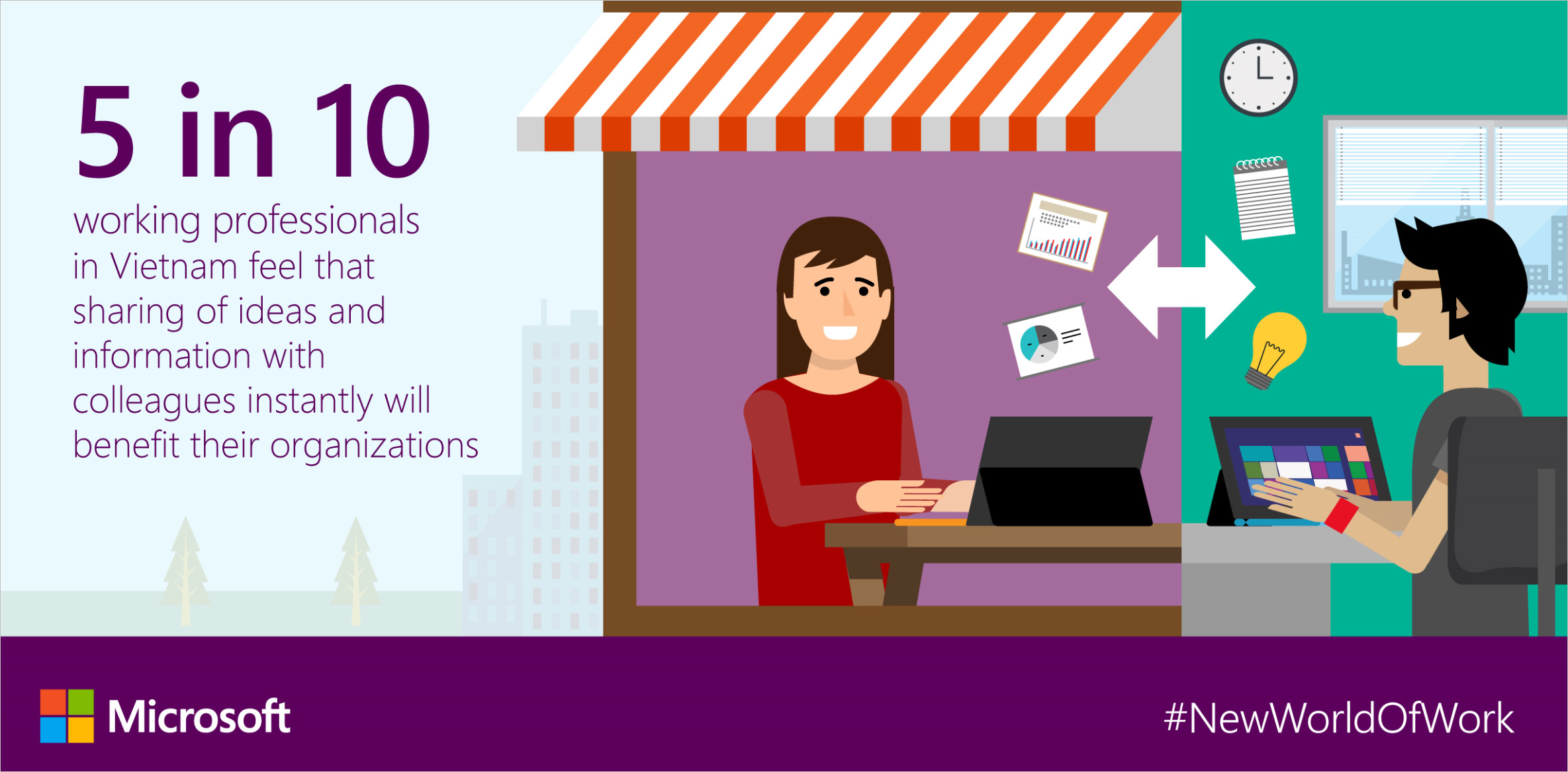 Trong một nghiên cứu mới đây của Microsoft với 5.000 người lao động văn phòng thuộc 13 quốc gia Châu Á, 46% người lao động Việt Nam chia sẻ rằng, họ luôn được khuyến khích để làm việc hiệu quả hơn, hợp tác hơn và sáng tạo hơn, đồng thời, vẫn đảm bảo các quyền lợi của họ trong hệ thống làm việc liên tục thay đổi.