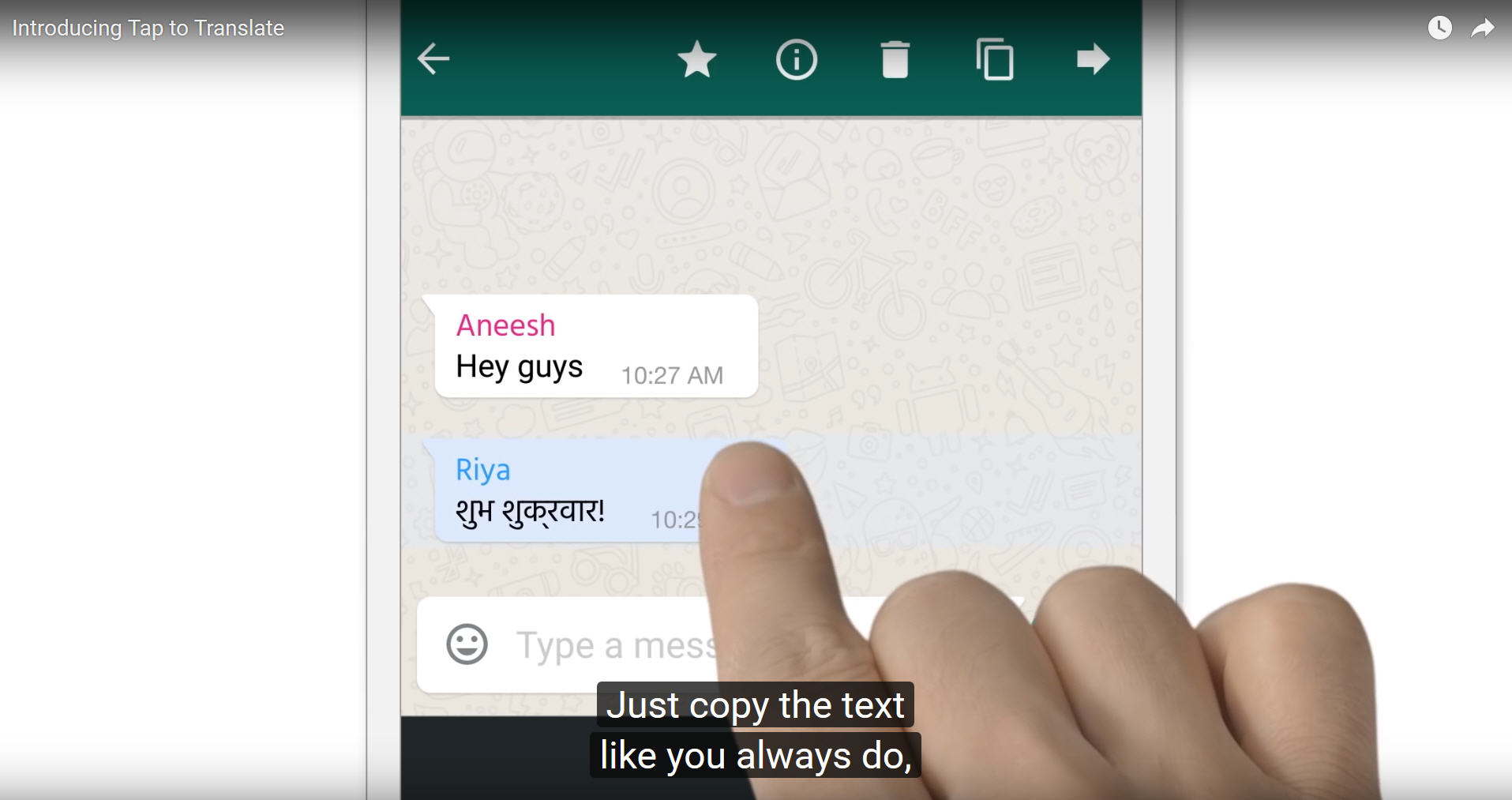 Google hiểu rằng hàng triệu nguời dùng đã dành nhiều thời gian để sao chép (copy) và dán (paste) văn bản giữa Google Dịch và các ứng dụng khác. Còn bây giờ, với tính năng Chạm để Dịch (Tap to Translate) bạn chỉ cần sao chép văn bản của một cuộc trò chuyện, phần bình luận, lời bài hát… trong bất kỳ ứng dụng nào bạn dùng, và một bản dịch của Google Dịch sẽ đuợc hiển thị ngay, không cần phải chuyển đôỉ các ứng dụng: