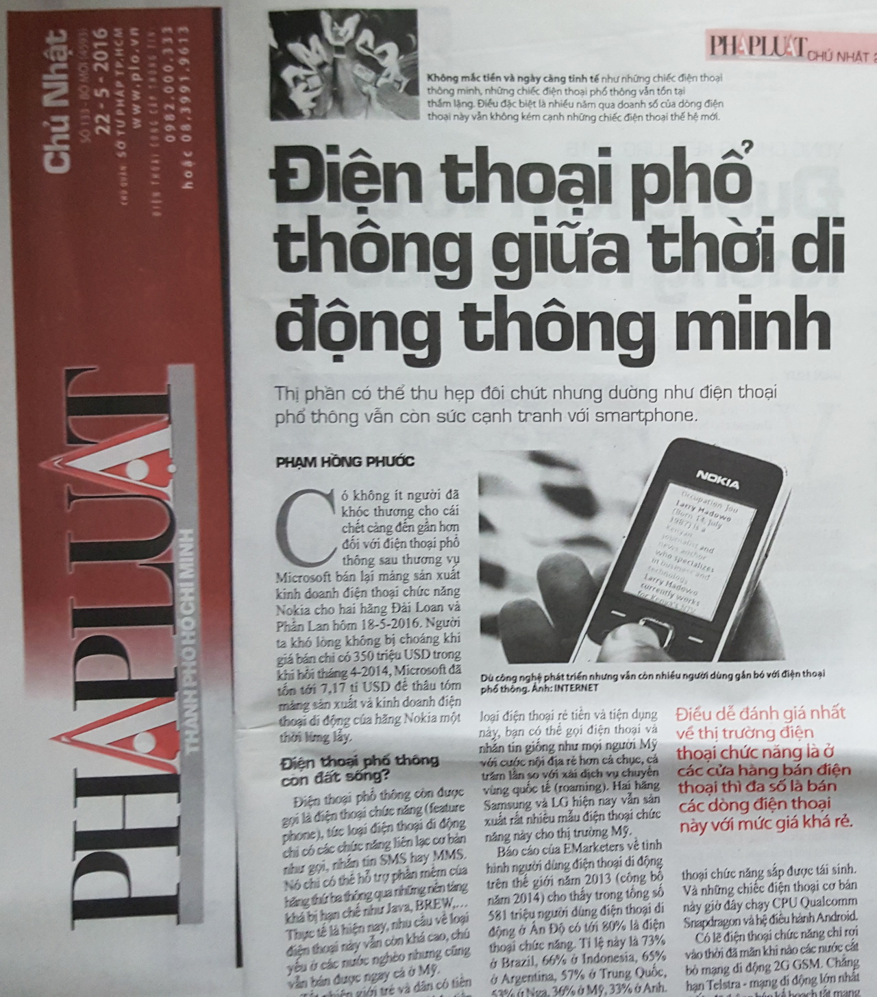 Có không ít người đã khóc thương cho cái chết càng đến gần hơn đối với điện thoại phổ thông sau thương vụ Microsoft bán lại mảng sản xuất kinh doanh điện thoại chức năng Nokia cho hai hãng Đài Loan và Phần Lan hôm 18-5-2016. Người ta khó lòng không bị choáng khi giá bán chỉ có 350 triệu USD trong khi hồi tháng 4-2014, Microsoft đã tốn tới 7,17 tỷ USD để thâu tóm mảng sản xuất và kinh doanh điện thoại di động của hãng Nokia một thời lừng lẫy.