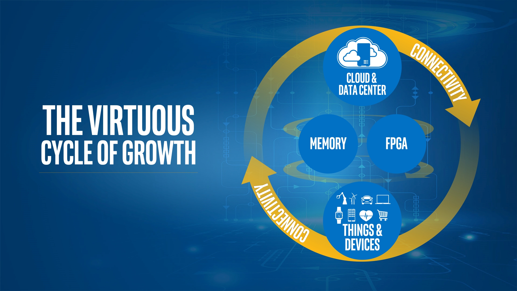Trong cái vòng “The Virtuous Cycle of Growth” của Intel bao gồm 4 đối tượng: Đám mây và trung tâm dữ liệu, bộ nhớ, FPGA (field-programmable gate array là một mạch tích hợp cho phép người dùng cấu hình, lập trình sau khi sản xuất), các đồ vật và thiết bị thông minh có tính năng kết nối. Tất cả các đối tượng trong vòng thuận tăng trưởng này đều được kết nối với nhau và lấy kết nối làm đặc trưng công nghệ.