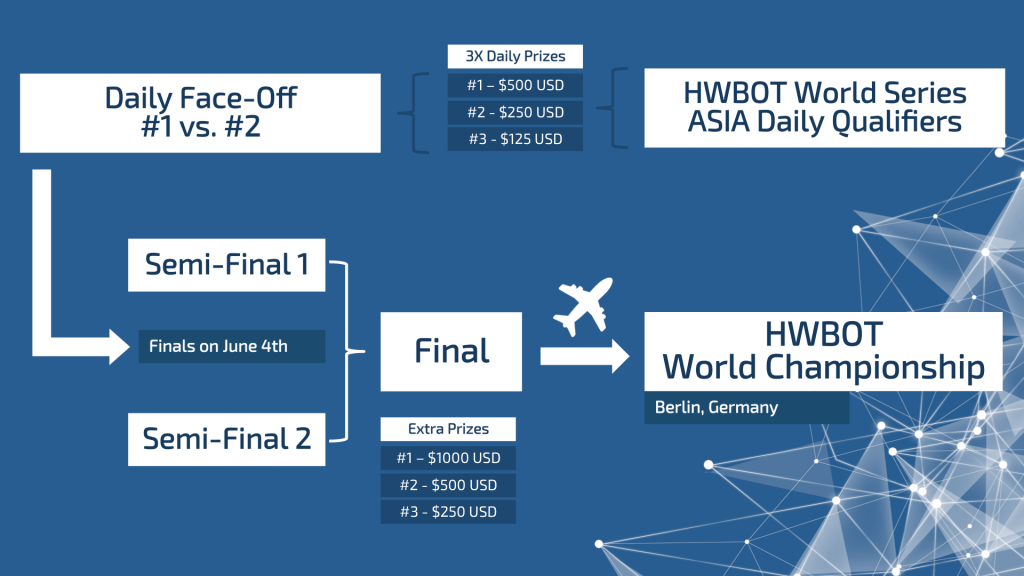 Trong 4 ngày vòng loại, cuộc thi bắt đầu từ 11g30ph (ngoại trừ ngày 31-5 bắt đầu lúc 12g vì có họp báo trước giải) và kéo dài tới 18g. Mỗi ngày chọn ra 3 overclocker đứng 3 thứ hạng đầu để nhận giải thưởng hàng ngày. Sau đó, từ 17g tới 18g, hai đấu thủ đứng hạng 1 và 2 đấu tay đôi với nhau để chọn người chiến thắng vào trận bán kết. Các trận bán kết diễn ra vào trưa 4-6 theo thể thức đấu tay đôi và loại trực tiếp. Hai người chiến thắng sẽ vào trận chung kết. Hai người thua trong trận bán kết tranh giải đồng. Địa điểm thi đấu: Trung tâm Triển lãm Nangang 4F Light Gallery (Area L Lobby)