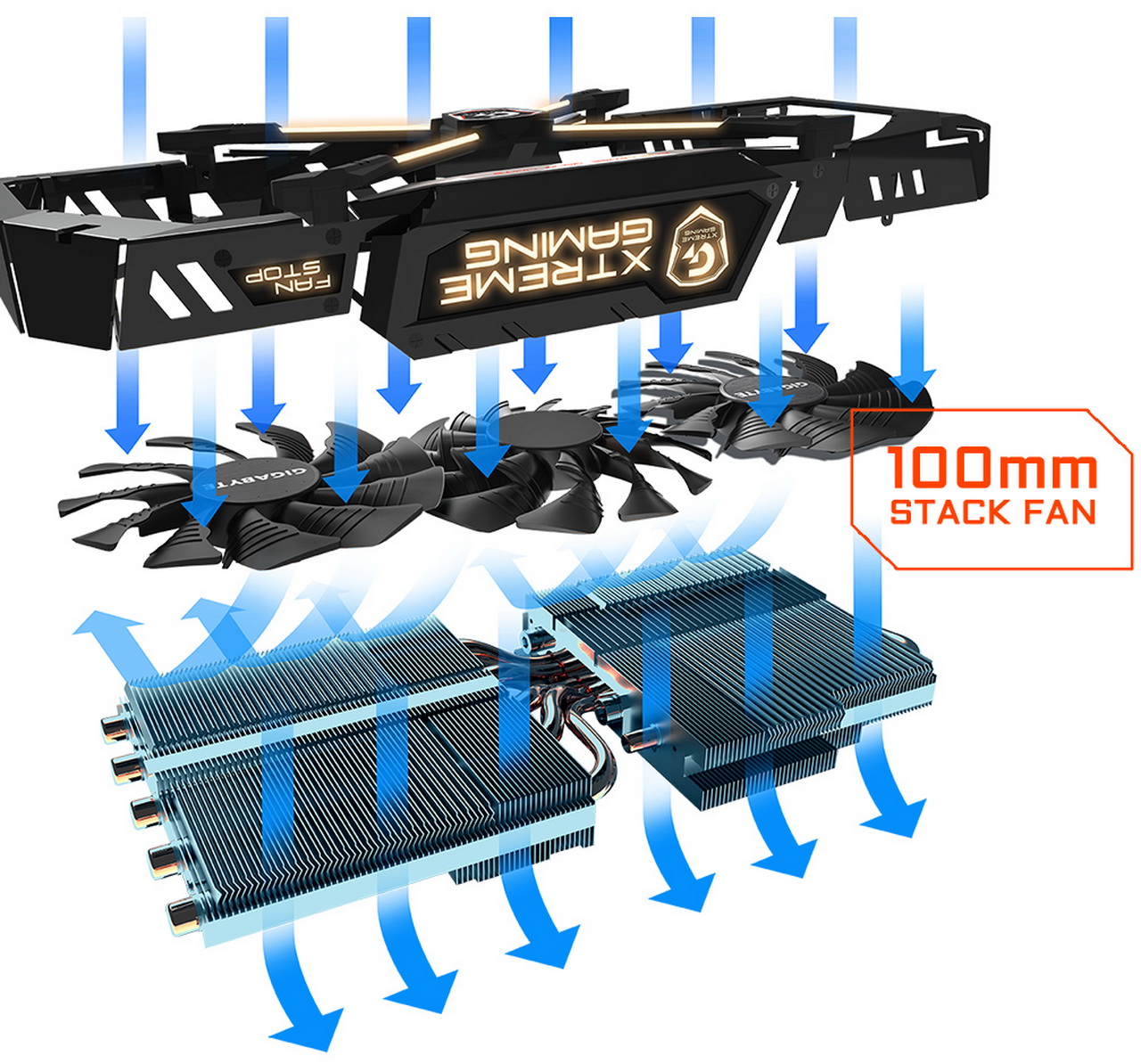 Sản phẩm có mức xung nhịp rất cao gồm xung Boost: 1936MHz / Base: 1784MHz ở OC mode và xung Boost: 1898MHz / Base: 1759MHz khi chạy ở chế độ Gaming. Cũng trên sản phẩm này, GIGABYTE giới thiệu một công nghệ làm mát hoàn toàn mới, rất độc đáo có tên gọi WindForce Stack 3X. Công nghệ này sử dụng 3 cánh quạt kích thước lớn 100mm đặt xếp chồng lên nhau, giúp tăng hiệu quả tản nhiệt thêm 10% so với cách bố trí thông thường.