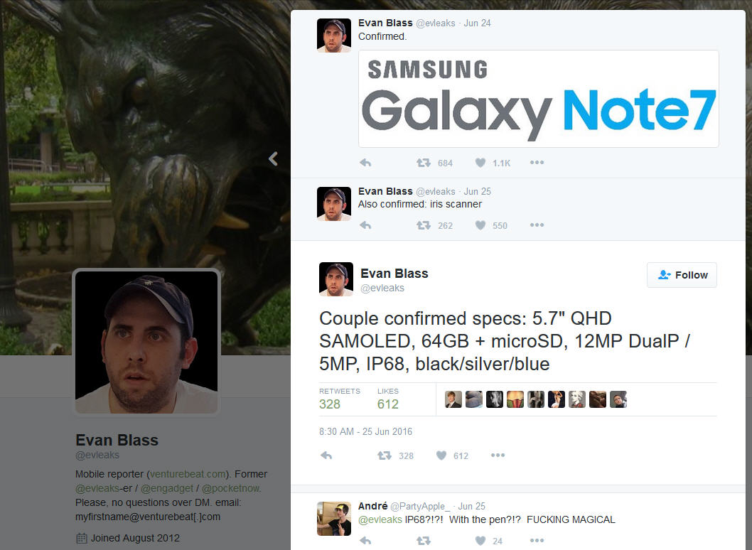 Ngày 24-6, nhà báo chuyên về di động Evan Blass tweet một cái lên tài khoản Twitter của mình khẳng định Galaxy Note 7 sẽ có cấu hình cơ bản: Màn hình 5.7 inch QHD Super AMOLED độ phân giải UltraHD, bộ nhớ ROM 64GB, hỗ trợ thẻ nhớ microSD, máy ảnh sau 12MP Dual Pixel, máy ảnh trước 5MP, có tính năng chống nước chuẩn IP68, có 3 màu đen, bạc và xanh biển.