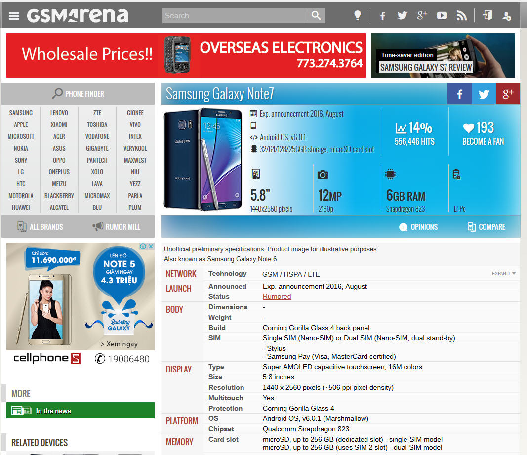 Trong khi đó, từ ít lâu nay, trang thông tin thiết bị di động nổi tiếng thế giới GSMArena đã dựng nguyên một trang sản phẩm cho Samsung Galaxy Note 7 với chú thích còn gọi là Note 6. Mặc dù cẩn thận ghi tình trạng thông tin (status) là “tin đồn” (rumored), nhưng trang Note 7 của GSMArena hiện đã có đầy đủ thông số kỹ thuật cơ bản của sản phẩm mà họ dự trù sẽ được Samsung chính thức tung ra vào tháng 8-2016. Theo đó, Note 7 có màn hình 5.8 inch Quad HD Super AMOLED (2560 x 1440 pixel) với kính cường lực Corning Gorilla Glass 4 ở cả hai mặt trước và lưng. Cũng có 2 phiên bản CPU. Phiên bản CPU Samsung dùng chip Exynos 8890. Phiên bản CPU Qualcomm chạy Snapdragon 823 mới tinh, công nghệ 10nm, Quad-core 2.2GHz Kryo (mạnh hơn 18% so với Snapdragon 820). Bộ nhớ RAM 6GB. Bộ nhớ ROM từ 32GB tới 256GB, hỗ trợ thẻ nhớ microSD tới 256GB. Hai camera như ở Galaxy S7. Pin 4.000mAh.