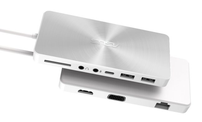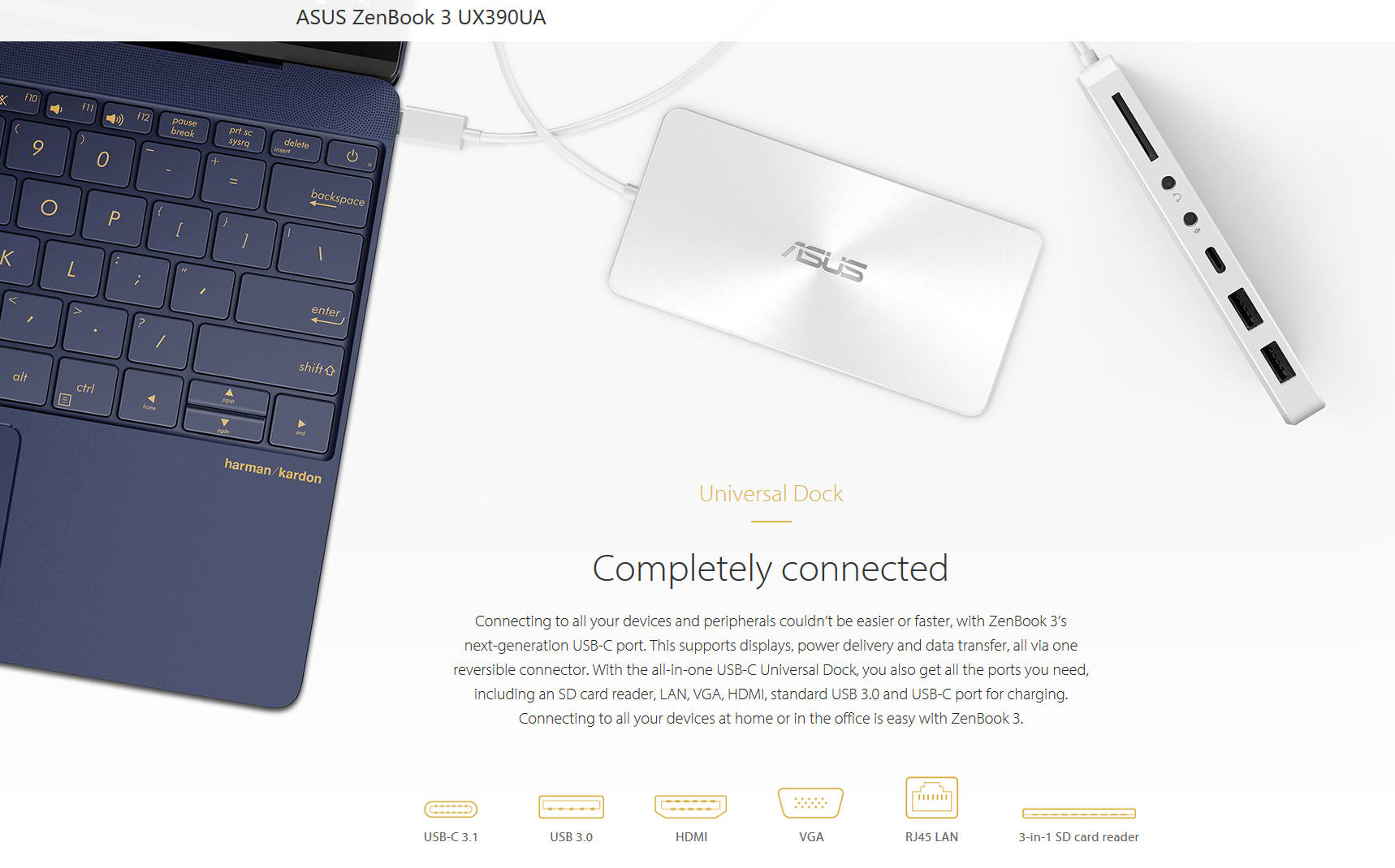 Cũng giống như các thiết bị ultrabook cực mỏng nhẹ, ZenBook 3 phải hy sinh hàng loạt cổng kết nối ngoại vi mà người dùng thường cần thiết. Trên máy chỉ có 1 cổng USB 3.1 Type-C (Gen 1) có đầu cắm có thể đảo chiều tuy tiện dụng nhưng chưa phổ biến. Không có khe đọc thẻ nhớ. Vì thế, để có thể có thêm cổng USB, bạn phải dùng USB Hub, nhưng hiện nay lại USB Hub có đầu cắm Type-C còn hiếm và đắt. Dĩ nhiên, ASUS có đưa ra giải pháp cho người dùng ZenBook 3 là một chiếc all-in-one USB-C Universal Dock. Trên chiếc hộp nho nhỏ và xinh xinh này có 2 cổng USB 3.0 chuẩn, 1 cổng USB 3.1 Type-C cho sạc, 1 cổng HDMI, 1 cổng VGA, 1 cổng LAN và 1 khe đọc thẻ nhớ SD 3-in-1. Tất nhiên là bạn phải mua thêm cái dock đa năng này.