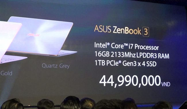 Khi giới thiệu chiếc laptop Zenbook cao cấp và mạnh nhất xưa nay của ASUS trên sân khấu sự kiện ASUS Zenvolution Việt Nam 2016 ngày 14-7-2016 tại TP.HCM, ông Jeff Lo, Tổng giám đốc ASUS Đông Nam Á 2, nhấn mạnh ASUS ZenBook 3 là chiếc laptop “có uy tín nhất thế giới với hiệu năng chưa từng có” (the world’s most prestigious laptop with unprecedented performance). ZenBook 3 đã nhận được giải thưởng Best Choice tại hội chợ triển lãm công nghệ châu Á COMPUTEX Taiepi 2016 hồi đầu tháng 6-2016. So sánh thẳng với dòng MacBook của Apple, dường như ASUS muốn làm ra một chiếc laptop Windows có sức mạnh vượt hơn cả MacBook Pro và thiết kế gọn nhẹ của MacBook hội tụ những tinh hoa nào mà ASUS có thể làm được cho dòng máy laptop. Khi mức giá chính hãng của laptop ZenBook 3 màn hình 12.5 inch Full HD 1080, CPU Intel Core i7 thế hệ 6, đồ họa tích hợp Intel HD Graphics 520, RAM 16GB, ổ lưu trữ SSD 1TB, Windows 10 Pro 64-bit được ông Jeff xướng lên, cả khán phòng vang lên những tiếng ồ nhiều cảm xúc. Laptop siêu mạnh, siêu đẹp có giá siêu cao tới 44.990.000 đồng. Đây là lần thứ 2 trong tháng 7-2016, chúng tôi nghe được những tiếng ồ tập thể như vậy khi nghe giá của một chiếc laptop. Trước đó 10 ngày, cũng tại GEM Center, HP ra mắt chiếc laptop Spectre mỏng nhất thế giới HP Spectre 13-v020TU (CPU tương tự, màn hình 13.3 inch FHD, RAM 8GB, ổ cứng SSD 256GB, Windows 10 Home) có giá 42.990.000 đồng.