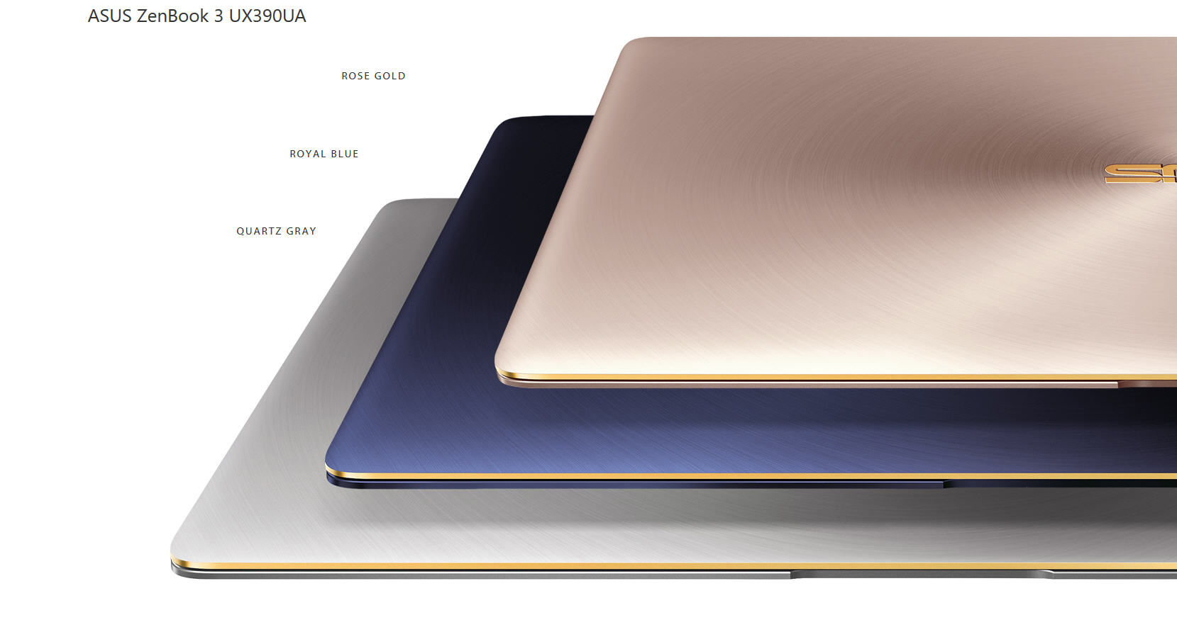 ASUS ZenBook 3 (UX390UA) là thế hệ ZenBook mới nhất được thiết kế hoàn toàn mới với độ mỏng chỉ 11,9mm và nặng chỉ 910g. Để có được kích thước siêu mỏng nhẹ nhưng vẫn cứng cáp, ZenBook 3 được chế tác từ hợp kim nhôm chuẩn hàng không vũ trụ, vật liệu cao cấp cứng hơn 50% so với chuẩn thông thường sử dụng trên laptop. Chất liệu hợp kim cao cấp này còn giúp làm nổi bật vẻ tinh tế của biểu tượng Zen với những vòng tròn đồng tâm được tạo nên bằng kỹ thuật mài kim loại tiên tiến. ASUS cho biết họ phải trải qua 32 công đoạn chế tác công phu để o bế cho cái vỏ máy toàn bộ bằng kim loại nguyên khối này. ZenBook 3 có 3 màu xanh hoàng gia (royal blue), vàng hồng (rose gold) và xám thạch anh (quartz gray). Máy còn được mạ điện qua một qui trình gồm 2 giai đoạn để tạo nên đường viền cạnh nắp màn hình màu vàng ánh được cắt bằng kim cương.