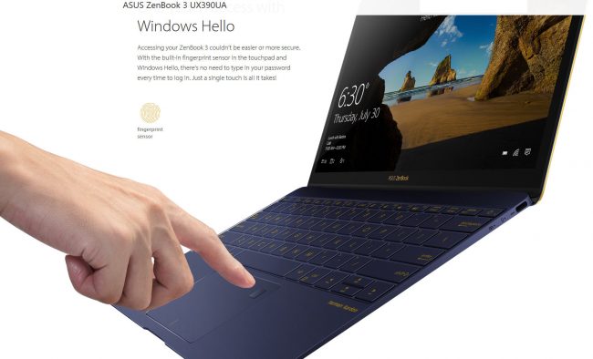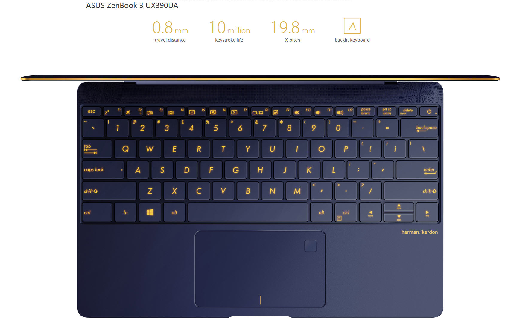 Bàn phím được thiết kế giúp trải nghiệm đánh máy thoải mái hơn. Các phím kích thước chuẩn của ZenBook 3 có đèn nền màu vàng kim với khoảng cách giữa các phím 19,8mm giống như bàn phím máy tính để bàn – với hành trình phím (key travel) chỉ 0,8mm (có khoảng cách gần gấp đôi nhiều laptop khác). Bàn phím trên ZenBook 3 mỏng hơn 28% so với thế hệ trước. Theo ASUS, độ bền của bàn phím này lên tới 10 triệu lần gõ (keystroke), tốt hơn 33% so với chuẩn của ngành. Bàn di chuột bằng kính mang đến trải nghiệm vuốt chuột mượt mà và chính xác hơn. Nó được tích hợp công nghệ nhận diện lòng bàn tay (palm-rejection technology) thông minh giúp tránh những sự cố do bất cẩn chạm lòng bàn tay. Ngoài ra, SmartGesture và tính năng hỗ trợ nhập liệu viết tay sẽ nâng cao độ khả dụng cho máy. Máy được tích hợp cảm biến đọc vân tay và hỗ trợ chức năng Windows Hello của Microsoft cho phép truy cập một chạm, giúp người dùng đăng nhập và mở khóa ZenBook 3 nhanh chóng và an toàn mà không cần phải gõ mật khẩu hay mã PIN.