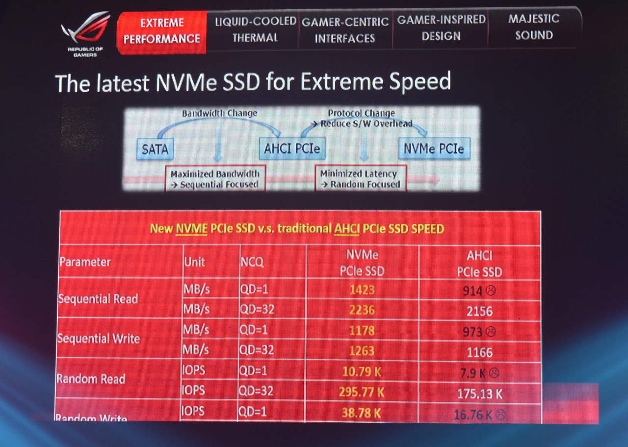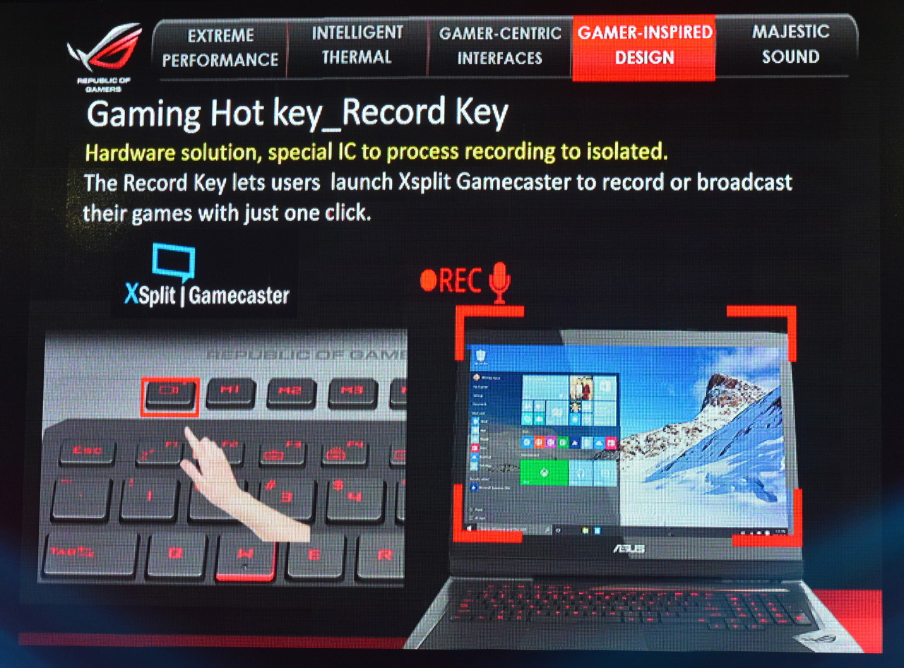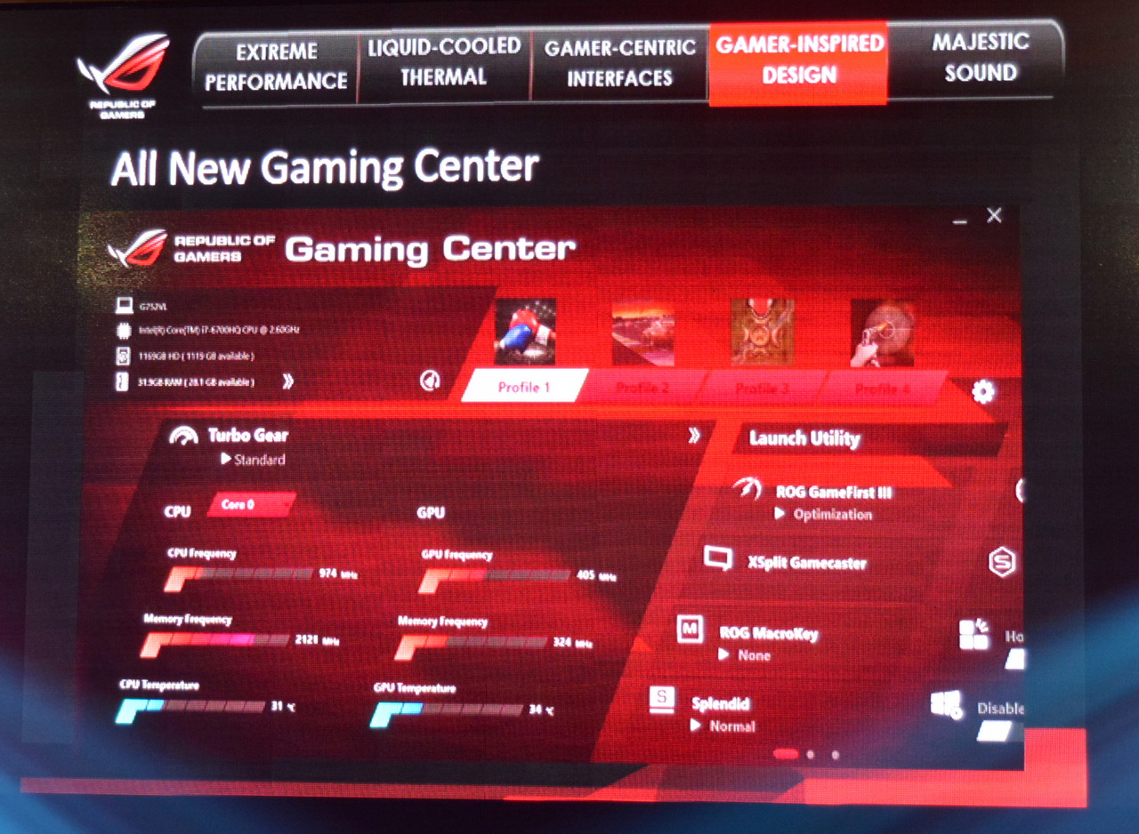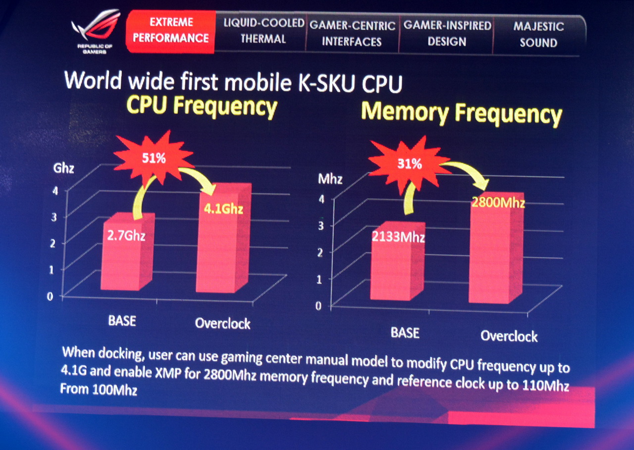 GX700 trang bị CPU Intel mobile K-SKU Core Gen 6 (Skylake) và card đồ họa NVIDIA GeForce GTX 980 có khả năng ép xung tăng 48% hiệu năng CPU, đồng hồ cơ bản BCLK (Base Clock) tăng 31%, cụ thể xung nhịp từ 3.2GHz lên 4.0GHz. Bên cạnh đó, bộ nhớ DDR4 cũng được ép xung 43% từ 2.133MHz đẩy lên đến 2.800MHz. Máy sử dụng ổ cứng thế rắn SSD với giao diện NVMe PCIe có tốc độ cực nhanh, không còn tình trạng thắt cổ chai băng thông như giao diện SATA. Vì thế, có thể nói GX700 có hiệu suất làm việc hệt như một chiếc máy tính để bàn chuyên game cao cấp nhất.