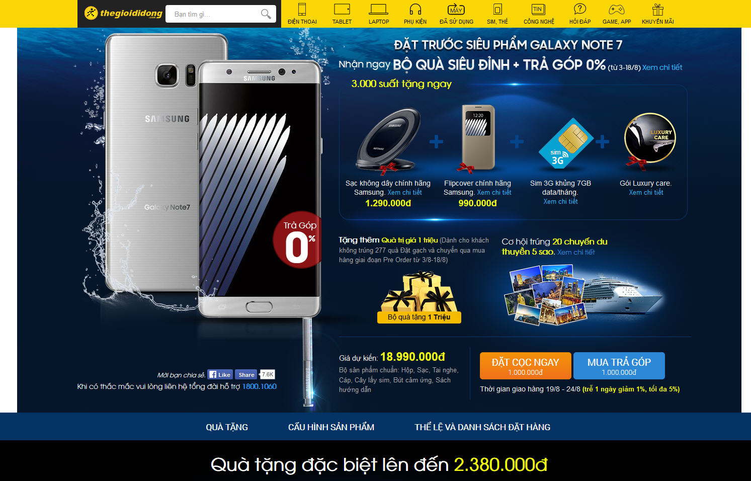 Hệ thống Thế giới Di động mở đợt đặt hàng trước Note7 với giá dự kiến 18.990.000 đồng và giao hàng từ 19-8-2016. Có 3.000 suất với bộ quà tặng trị giá 2.380.000 đồng. Khách đặt cọc 1.000.000 đồng (có thể nhận lại tiền cọc bất cứ lúc nào nếu không mua nữa). Có cho trả góp 0%.