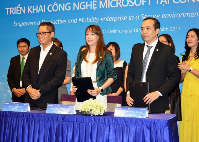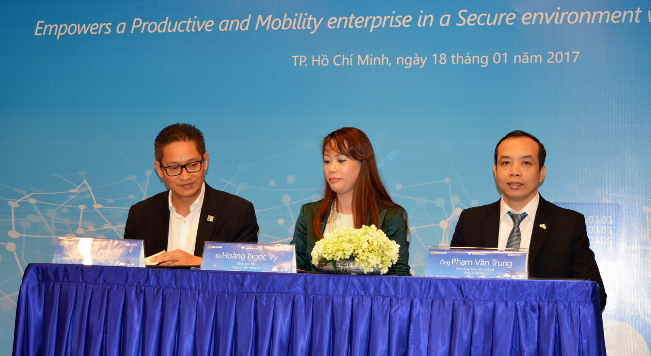 Từ trái: ông Vũ Minh Trí, Tổng giám đốc Microsoft Việt Nam; bà Hoàng Ngọc Vy, CEO Viễn Thông A; và ông Phạm Văn Trung, Phó Tổng giám đốc kỹ thuật Công ty CMC SI Sài Gòn đang ký kết hợp tác.