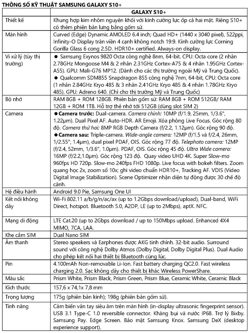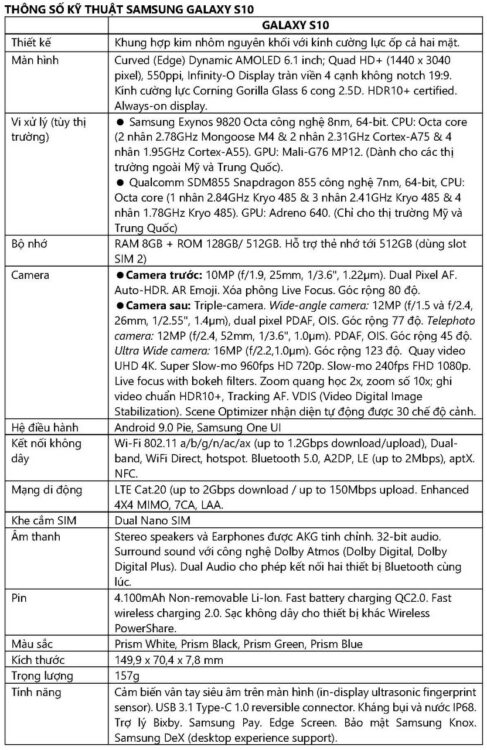 Thông tin chi tiết về dòng Samsung Galaxy S10 series.