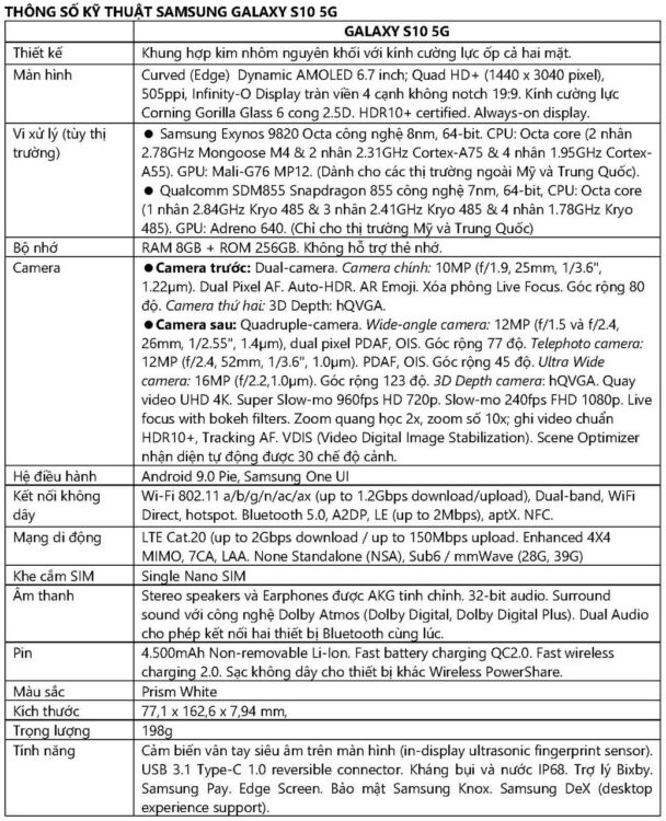 Galaxy S10 cung cấp mọi thứ bạn mong đợi từ dòng Galaxy S và hơn thế nữa – bao gồm sạc nhanh không dây 2.0, chuẩn kháng nước và bụi IP68, bộ vi xử lý thế hệ mới và các dịch vụ của Samsung như Bixby, Samsung Health, Samsung Pay và Samsung DeX. Bạn sẽ có được dung lượng lưu trữ lớn nhất trên thiết bị Galaxy S10+ với 1TB dung lượng lưu trữ tích hợp và khả năng mở rộng bộ nhớ lưu trữ lên đến tối đa 1,5TB với thẻ nhớ rời 512GB micro SD.