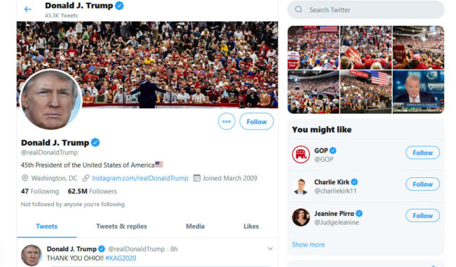 Mạng truyền thông xã hội chia sẻ tin nhắn Twitter vừa có một hành động mà đài BBC News dẫn kênh truyền hình thời sự Mỹ CNN nhận định rằng có thể sẽ khiến Tổng thống Donald Trump mạnh miệng hơn rằng các công ty truyền thông xã hội chống lại ông và những người ủng hộ. Twitter tối 30-7-2019 đã đình chỉ một tài khoản có nội dung mà ông vừa tweet lại chỉ vài giờ trước đó.