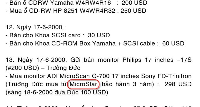 Bạn Lê Hoàng Sơn, hiện là giám đốc điều hành, nói: ‘Anh có để lại nhiều dấu chân trên hành trình Viễn Sơn đó nghen.” Thiệt ra, Viễn Sơn – hồi đó là cửa hàng tin học MicroStar trên đường Bùi Thị Xuân (cửa hàng hẹp thôi, nằm ở xích về phía Cống Quỳnh chớ không hoành tránh ở vị trí hôm nay) đã gắn với cái nghiệp IT của tôi từ khi tôi mới ABC vỡ lòng vào cõi mộng ảo này. Nói thiệt ra, trong tổng thu nhập của Viễn Sơn của suốt 1 phần 4 thế kỷ qua, có một phần không ít từ cái tụng bàng của tôi. Dân chơi đâu sợ mưa rơi. Tôi còn lưu lại cái lịch sử nâng cấp PC của mình. Xin trích lại 2 mẩu có liên quan tới mấy món linh kiện PC mà tôi mua ở MicroStar, như cái motherboard ASUS P2L97 chạy CPU Intel Pentium II 300MHz mà tôi mua ở MicroStar ngày 16-4-1998 với giá 140 USD (tương đương 4 chỉ vàng), hay cái màn hình ADI MicroScan G-700 17 inch mua ngày 17-6-2000 giá 298 USD.