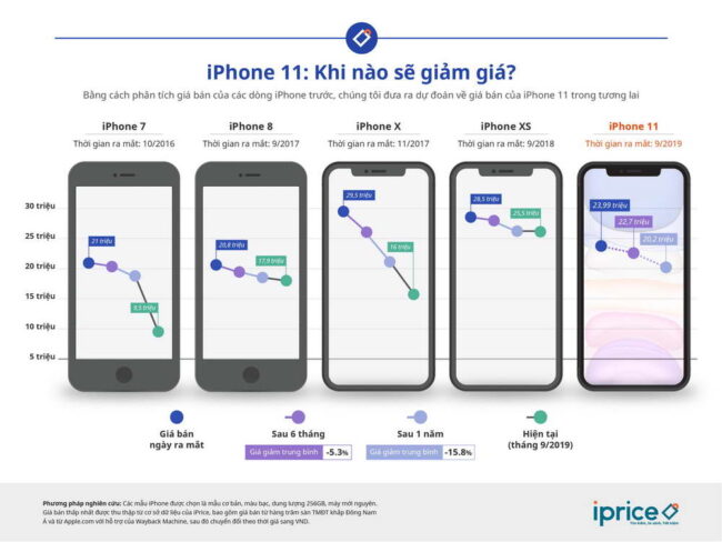 Để đưa ra câu trả lời cho tính thuyết phục cao hơn cho những “tâm tư” này, Công ty tìm kiếm và so sánh giá iPrice Group mới đây đã nghiên cứu giá bán trên các trang thương mại điện tử của các mẫu iPhone, từ đó đưa ra dự đoán về các đợt giảm giá có thể có cho iPhone 11. Các dòng máy được iPrice phân tích bao gồm: iPhone 7, iPhone 8, iPhone X và iPhone Xs.