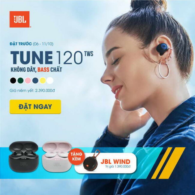 Trong dịp này, JBL tiến hành chương trình đặt trước tại Việt Nam cho sản phẩm tai nghe không dây in-ear mới TUNE120TWS với công nghệ JBL Pure Bass Sound. Từ ngày 6 tới 11-10-2019, khách đặt mua trước tai nghe JBL TUNE120TWS giá 2.390.000 đồng được tặng thêm loa bluetooth JBL Wind trị giá 1.390.000 đồng.