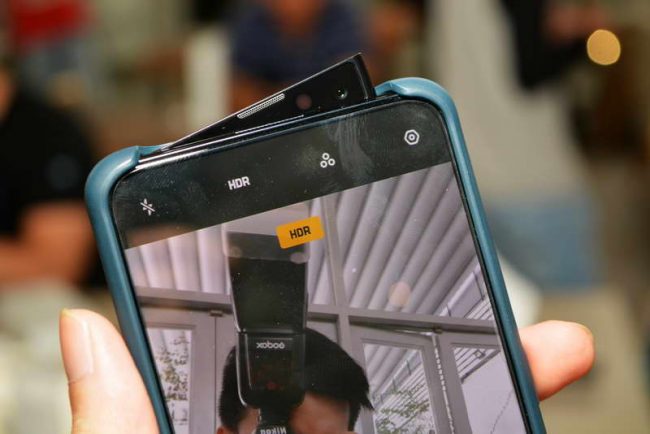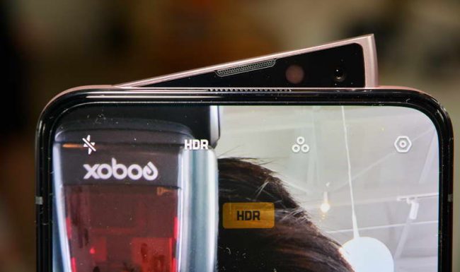 Camera selfie motorized pop-up 16MP, f/2.0, 26mm (wide), 1/3.1″, 1.0µm, có đèn LED flash. Đây là camera selfie pop-up đầu tiên trên thế giới hỗ trợ hiệu ứng xóa phông Bokeh khi quay video.