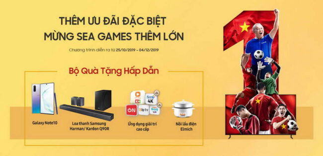 Samsung Vina đã giới thiệu các gói khuyến mại đa dạng cho mùa thể thao SEA Games 2019 (diễn ra ở Philippines từ 30-11 tới 11-12-2019). Chương trình áp dụng cho hơn 65 mẫu sản phẩm Samsung bao gồm các loại TV QLED 8K, QLED 4K, UHD, Full HD và loa thanh được mua từ ngày 25-10 đến hết ngày 4-12-2019.