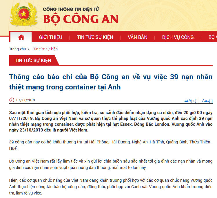 Trên Công thông tin điện tử của mình, Bộ Công an Việt Nam tối 7-11-2019 đã ra “Thông cáo báo chí của Bộ Công an về vụ việc 39 nạn nhân thiệt mạng trong container tại Anh”. Toàn văn như sau:
