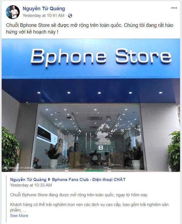 Ngày 12-11-2019 trên tài khoản Facebook của mình, ông Nguyễn Tử Quảng, Chủ tịch – CEO của Bkav, đăng post: “Chuỗi Bphone Store đang được mở rộng trên toàn quốc, ngay từ hôm nay.” Ông nói thêm: “Chuỗi Bphone Store sẽ được mở rộng trên toàn quốc. Chúng tôi đang rất hào hứng với kế hoạch này!” Ông đăng kèm ảnh chụp Bphone Store đầu tiên được mở ở Hà Nội.
