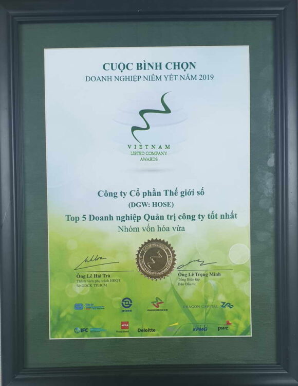 Công ty Cổ phần Thế Giới Số (Digiworld Corporation – “DGW”) ngày 27-11-2019 đã nhận giải TOP 5 Doanh nghiệp Quản trị Công ty tốt nhất năm 2019, thuộc nhóm Doanh nghiệp Niêm yết có quy mô vốn hóa trung bình do Sở Giao dịch Chứng khoán TP. HCM, Sở Giao dịch Chứng khoán Hà Nội cùng báo Đầu Tư tổ chức.