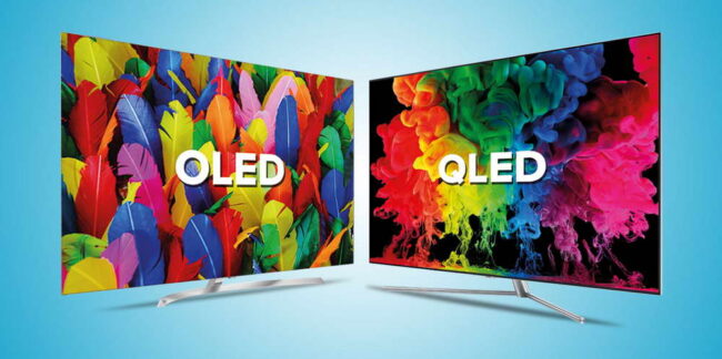 OLED và QLED là 2 công nghệ tấm nền hiển thị hình ảnh hoàn toàn khác nhau. OLED (Organic light-emitting diode, điốt phát quang hữu cơ) có các điểm ảnh tự phát sáng mà không cần đèn nền hay bộ lọc màu sắc. Trong khi QLED (Quantum dot LED, đèn LED chấm lượng tử) là một thuật ngữ do Samsung tự đặt ra cho công nghệ tấm nền LED thông thường được bổ sung thêm một tấm chấm lượng tử phủ trên đèn nền.
