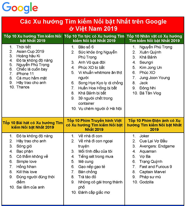 10 từ khóa của danh sách Xu hướng Tìm kiếm Nổi bật Việt Nam 2019 trải rộng các yếu tố từ thời sự xã hội, đến thể thao, giải trí và cả công nghệ. Lần đầu từ khóa “Thời tiết” dẫn đầu danh sách này cho thấy mức độ quan tâm rất lớn của người dân Việt Nam về những chuyển biến liên quan thời tiết và môi trường trong năm qua. “Bão số 6” là từ khóa dẫn đầu danh sách Tốp 10 Tin tức có Xu hướng Tìm kiếm Nổi bật nhất 2019.