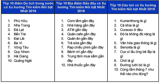 Điểm đặc biệt của Danh sách Tìm kiếm Nổi bật của người Việt Nam năm 2019 là danh sách Tốp 10 Câu hỏi được người Việt hỏi nhiều nhất. Google không chỉ là cỗ máy tìm kiếm bằng các từ khóa, mà còn hơn thế nữa, nhất là khi ngày càng ứng dụng công nghệ trí tuệ nhân tạo AI sâu rộng hơn. Người dùng tại Việt Nam ngày càng tận dụng sức mạnh tìm kiếm ngữ nghĩa theo dạng một câu hỏi thay vì một từ khóa để có lời giải đáp trọn vẹn và chính xác hơn. Từ “Kumanthong là gì”, hay một từ đang trở thành trào lưu trên mạng xã hội là “cà khịa” cũng góp mặt với “cà khịa là gì”, hoặc trận thi đấu bóng đá giữa đội tuyển Việt Nam với đội tuyển Curacao ở King’s Cup 2019 cũng đẩy câu hỏi “Curacao ở đâu” lên Tốp 10. Một số câu hỏi thú vị cho thấy người Việt rất quan tâm đến diễn biến thời sự và muốn tìm hiểu sâu hơn khi “văn hóa giao thông là gì” cùng “đường lưỡi bò là gì” vào Tốp danh sách.