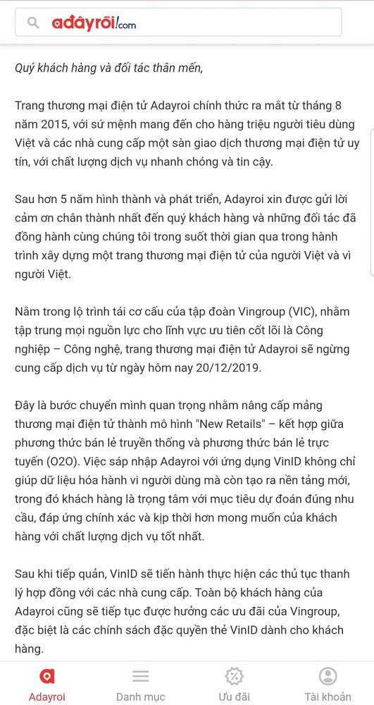 Ngay trước đó, Adayroi.com (A Đây Rồi) vào ngày 17-12-2019 và tiếp theo là Vinpro.vn ngày 19-12-2019 cũng ngừng hoạt động.