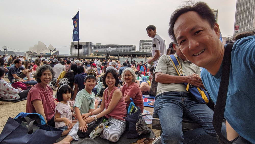 Bạn Lê Nam (góc phải) và gia đình mình đang chờ xem bắn pháo hoa ở cầu cảng Sydney ngày 31-12-2019. Bạn Hà Lâm Tú Quỳnh ngồi thứ 4 từ trái qua. (Ảnh từ FB của bạn Lê Nam).