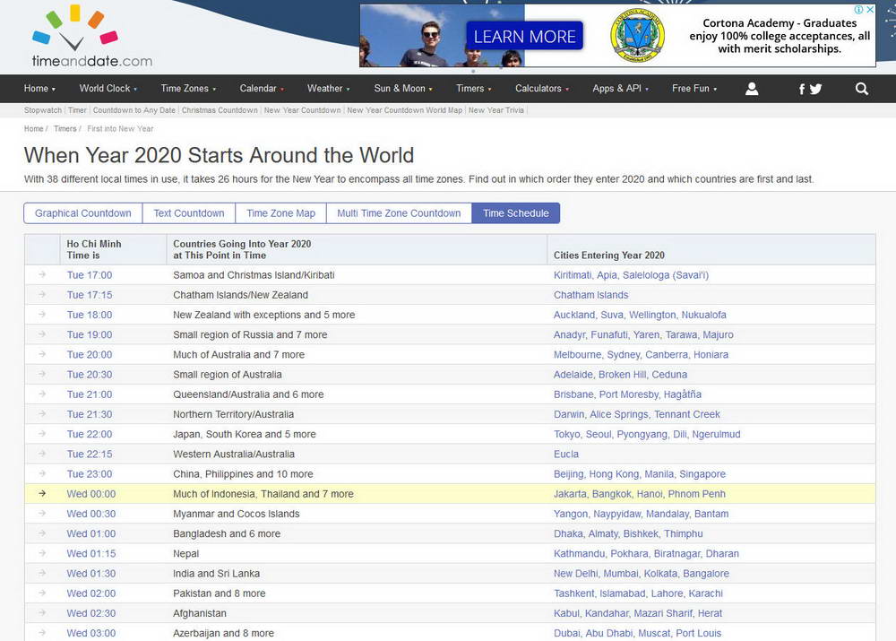 Bạn có thể vào trang này để tham khảo giờ đón giao thừa 2020 trên toàn cầu.