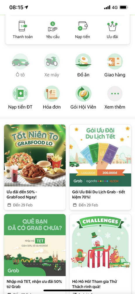 Gói ưu đãi du lịch Grab đã được siêu ứng dụng đa dịch vụ Grab hợp tác cùng Agoda và Klook ra mắt tại Việt Nam mùa Tết Nguyên đán Canh Tý nhằm mang đến cho người dùng trải nghiệm du lịch tiết kiệm và tiện lợi hơn. Gói ưu đãi du lịch Grab với giá 200.000 đồng dành cho các khách hàng thanh toán qua ví điện tử Moca được mở bán từ ngày 13-1-2020 đến ngày 29-2-2020 với 7 ưu đãi đa dạng từ các đối tác hàng đầu là Agoda, Klook, các dịch vụ di chuyển trên nền tảng Grab và giao nhận thức ăn GrabFood.