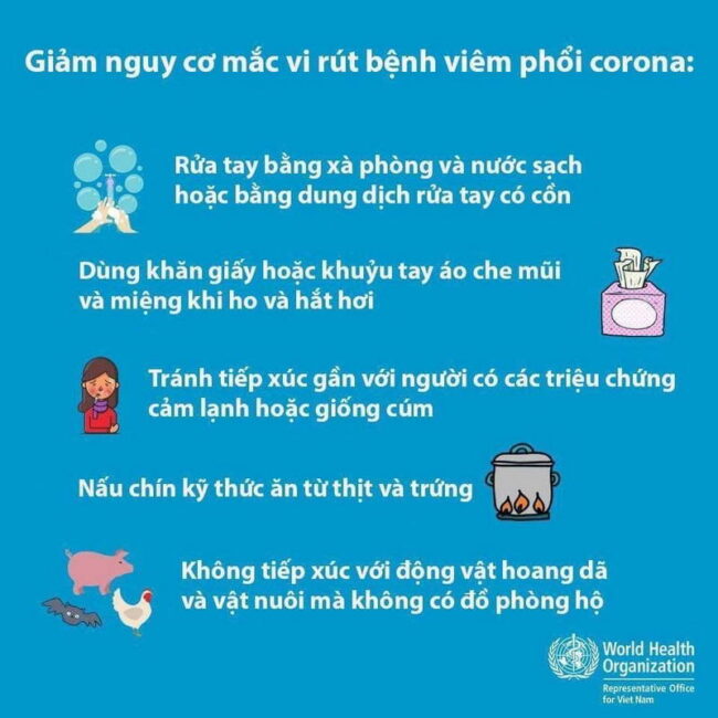 Tổ chức Y tế Thế giới WHO đã đưa ra hướng dẫn phòng tránh và hạn chế lây lan căn bệnh viêm phổi cấp do Coronavirus gây ra, hay còn gọi là virus Vũ Hán – lấy theo tên thành phố Wuhan của tỉnh Hubei (Hồ Bắc) ở Trung Quốc – nơi bùng phát “bệnh lạ” này hồi tháng 12-2019.