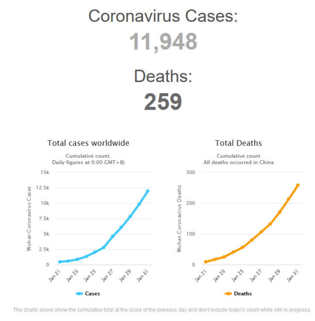 + Thông báo của Ủy ban Sức khỏe Quốc gia Trung Quốc (National Health Commission) và Tổ chức Y tế Thế giới (WHO) cập nhật vào sáng 1-2-2020 cho biết ở Trung Quốc trong 24 giờ qua đã có thêm 46 người chết (so với số tăng 43 người hồi sáng 31-1-2020), tất cả đều ở tỉnh Hubei, khiến tổng số người chết vì Wuhan coronavirus lên tới 259 người (tăng so với 213 người vào sáng hôm trước). Tất cả đều ở đại lục Trung Quốc. Có khoảng 2.100 ca nhiễm mới (so với 1.982 ca nhiễm mới vào sáng 31-1) được xác định ở Trung Quốc, đưa số ca nhiễm ở đại lục nước này lên 11.791 người (tăng so với 9.692 người) và trên toàn thế giới lên 11.948 người (tăng so với 9.821 người). Có 26 nước và vùng lãnh thổ (so với 22 nơi sáng hôm trước) bên ngoài đại lục Trung Quốc đã có người nhiễm Wuhan coronavirus. Các số liệu này có thể thay đổi theo nguồn và thời điểm ghi nhận.