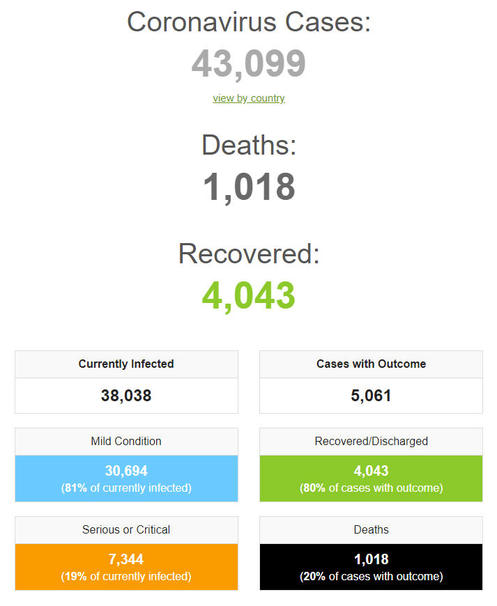 + Theo số liệu của trang Worldometers sáng 11-2-2020, cả thế giới đã có 43.099 người nhiễm virus (tăng từ 40.553 người sáng qua), trong đó có 7.344 người (tăng so với 6.494 người hôm qua) trong tình trạng nguy kịch, chiếm 19% trong tổng số nhiễm). Riêng ở đại lục Trung Quốc có 42.638 người nhiễm (tăng từ 40.171 người sáng qua). Có 1.018 người tử vong (tăng từ 910 người hồi sáng qua), trong đó 1.016 người ở đại lục Trung Quốc (tăng so với 908 người hồi sáng qua) và 2 người ở Philippines và Hong Kong. Có 108 người chết trong ngày 10-2. Số người được chữa khỏi 2019-nCoV hiện là 4.043 người (tăng từ 3.324 người vào sáng qua). Trừ đi số đã xác định (outcome) bao gồm tử vong, khỏi bệnh và xuất viện, số người hiện đang nhiễm là 38.038.