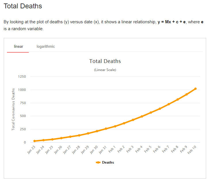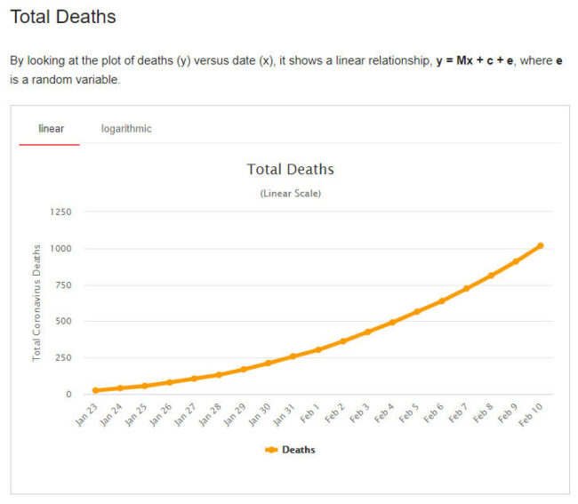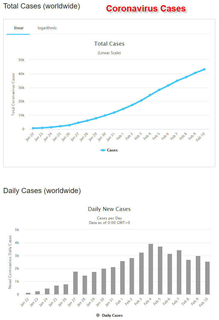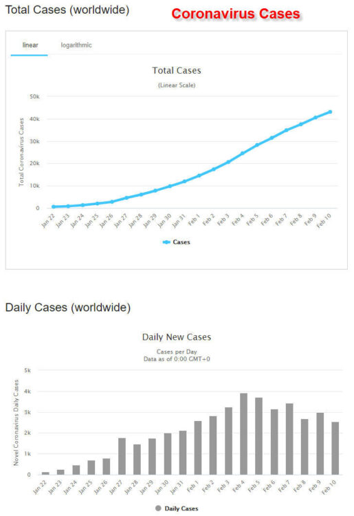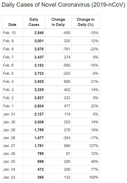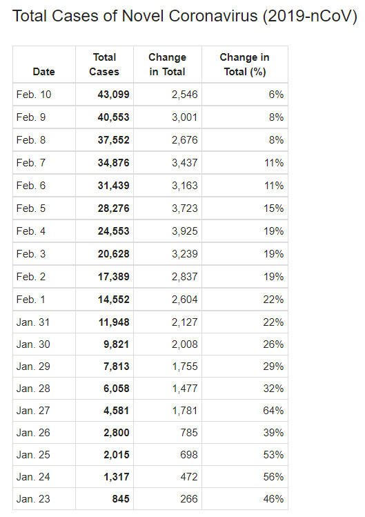 Theo những số liệu chính thức, chủ yếu được Trung Quốc báo cáo cho Tổ chức Y tế Thế giới (WHO), tốc độ tăng người nhiễm Wuhan coronavirus trên toàn cầu đang giảm dần từ ngày 2-2-2020 (lần đầu tiên có mức tăng dưới 20%, ở mức 19%, so với mức tăng 22% từng ngày trong 2 ngày trước); hai ngày 6 và 7-2 có mức tăng 11%/ngày; ngày 8-2 lần đầu tiên mức tăng dưới 10%, ở mức 8%; ngày 9-2 cũng tăng 8%; và ngày 10-2 tăng 6%.)