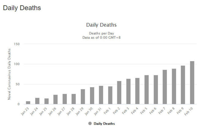 Ngày 10-2 là ngày có số lượng người tử vong cao nhất (108 người) kể từ khi phát hiện ca tử vong đầu tiên ngày 9-1-2020. Ngày 9-2 có 97 người chết, ngày 8-2 có 89 người chết, ngày 7-2 có 86 người chết, hai ngày 6 và 5-2 có 73 người chết /ngày, ngày 4-2 có 66 người, ngày 3-2 có 64 người chết, ngày 2-2 có 58 người chết, ngày 1-2 có 45 người chết và ngày 31-1 có 46 người chết.