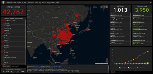 + Trang thông tin cập nhật về dịch Wuhan coronavirus 2019-nCoV Global Cases Johns Hopkins CESE của trường Đại học Y Johns Hopkins, một trường có tiếng ở Mỹ, tính tới sáng 10-2-2020 (theo giờ VN), ghi nhận: có 42.767 trường hợp nhiễm virus được xác nhận trên thế giới (so với 40.522 trường hợp hồi sáng qua), trong đó có 42.310 ca ở đại lục Trung Quốc (so với 40.146 ca hồi tối qua). Có 1.013 người tử vong (so với 910 người hồi sáng qua), gồm 1.011 người ở đại lục Trung Quốc, 1 người Trung Quốc ở Philippines và 1 người Hong Kong chết ở Hong Kong. Và có 3.950 người bệnh đã được điều trị hồi phục (so với 3.301 người hồi sáng qua), trong đó có 2.222 người ở tỉnh Hubei tâm dịch. Không hiểu sao cho tới nay, trang này vẫn chỉ ghi nhận có 1 ca được chữa khỏi ở Việt Nam trong khi Việt Nam ngày 4-2-2020 thông báo có 3 trường hợp chữa khỏi và ngày 10-2-2020 có thêm 3 người được chữa khỏi và xuất viện, nâng tổng số lên 6 người trong trổng số 15 người nhiễm.
