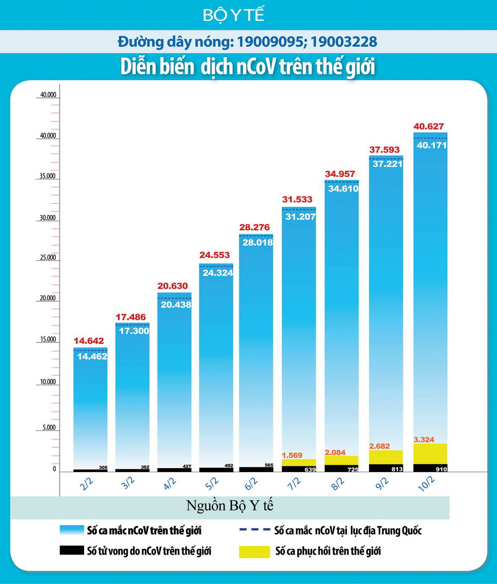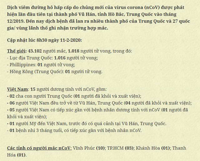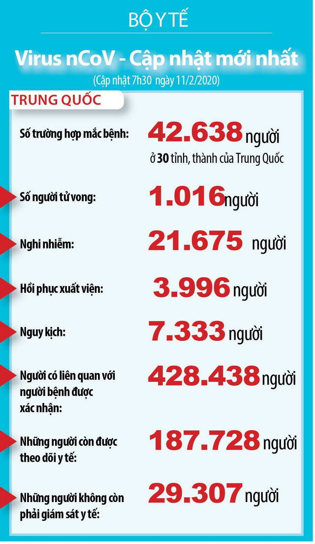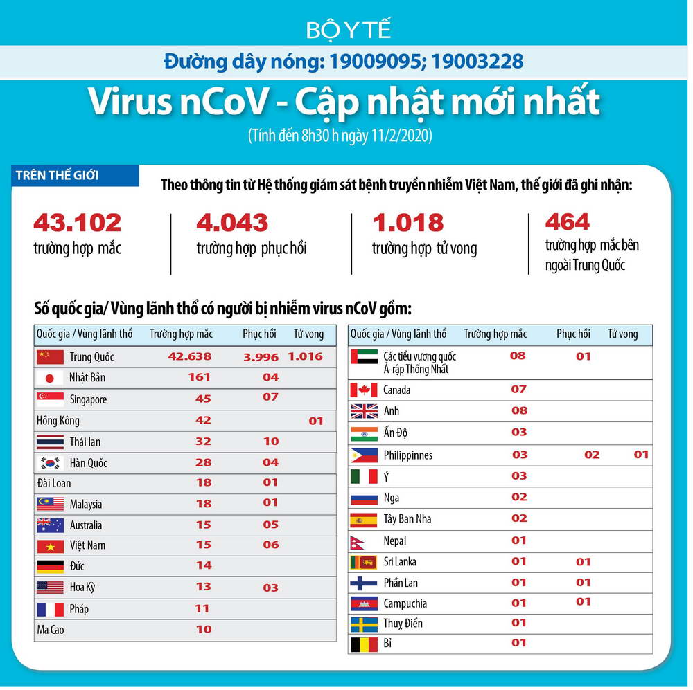 + Số liệu của Bộ Y tế Việt Nam cập nhật lúc 8g00 ngày 11-2-2020 cho biết cả thế giới có 43.102 người nhiễm virus (so với 40.554 người vào sáng qua). Có 1.016 người chết, trong đó 1.014 người ở đại lục Trung Quốc, 1 người ở Philippines và 1 người ở Hong Kong. Như vậy có 2 trường hợp tử vong vì virus 2019-nCoV bên ngoài đại lục Trung Quốc, là người đại lục Trung Quốc và Hong Kong.