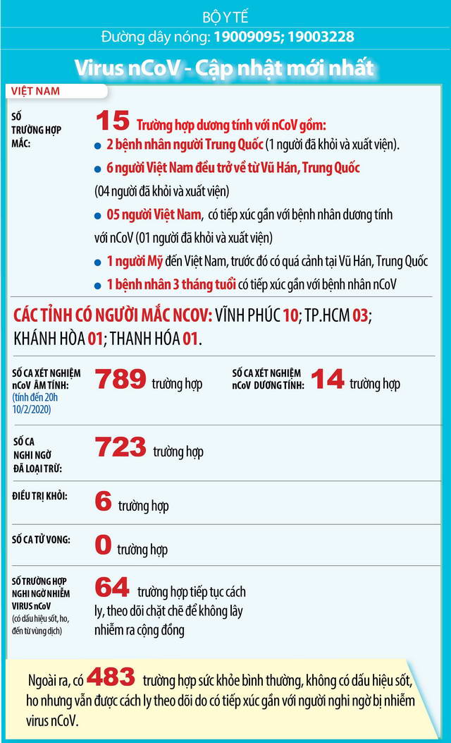Riêng tại Việt Nam: có 15 ca nhiễm virus 2019-nCoV (gồm 12 người Việt Nam, 2 người Trung Quốc, và 1 người Mỹ gốc Việt). 4 tỉnh thành có điều trị người nhiễm nCoV là Vĩnh Phúc (10 người), TP.HCM (3 người), Khánh Hòa (1 người), và Thanh Hóa (1 người). Có 64 trường hợp nghi nhiễm (sốt, ho, tới từ vùng dịch) đang được cách ly, tiếp tục theo dõi để hạn chế nguy cơ lây nhiễm cho cộng đồng. (Giảm so với 82 trường hợp sáng hôm qua). Ngoài ra, còn có 483 trường hợp có sức khỏe bình thường, không có các dấu hiệu sốt ho, nhưng vẫn được cách ly theo dõi do có tiếp xúc gần với người nghi nhiễm virus. (Giảm so với 517 trường hợp hồi sáng qua).