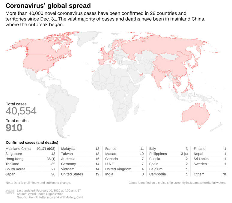 The novel coronavirus (2019-nCoV) is affecting 28 countries and territories around the world. Dates below are based on GMT+0.