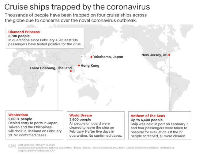 – Cho tới nay có 4 tàu du lịch biển (cruise ship) đã bị “mắc cạn” vì dịch bệnh do virus 2019-nCoV gây ra.