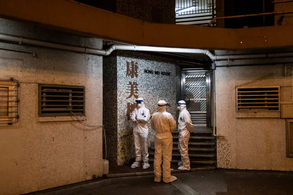Nhân viên y tế đang kiểm tra chung cư Hong Mei sáng sớm 11-2-2020 vì tình nghi Wuhan coronavirus lây qua đường ống của chung cư này. (Ảnh: Lam Yik Fei for The New York Times/ Internet. Thanks.)